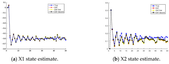 where , , , , and are independent white noises obeying normal distribution in the system, and , and satisfy the conditions in Equation (3). and are mutually uncorrelated white noise, and , assuming that the initial true value of the original state model is the initial value of the original model state, , and the initial estimation error covariance matrix is . The estimation of the target states and are compared to the target states using the extended Kalman filter (EKF) with the Kalman filter with high-precision residual term substitution (REKF).