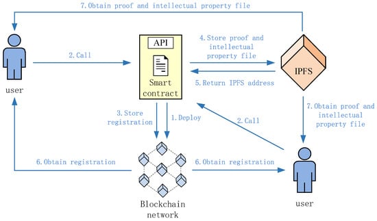 In 2008, Satoshi Nakamoto published a paper titled “Bitcoin: A peer-to-peer electronic cash system” [], which proposed a decentralized trading system with blockchain technology as the core technology. In blockchain technology, each node is a peer, ensuring the symmetry of information. Blockchain technology is a decentralized distributed ledger technology in which all nodes participate in maintaining a public ledger through a consensus mechanism. Blockchain uses cryptographic hash functions to calculate a hash value of data in a block, and the latter block stores the hash value of the previous block, forming a chain structure. Due to the characteristics of hash functions, any modification to data will cause changes in the hash value, thereby disrupting the integrity of the blockchain. This method achieves the immutability of on-chain data []. Due to the openness and transparency of the ledger, as well as the chain structure of storage, it is easy to trace the entire transaction chain. The decentralized, tamper-proof, and traceable features of blockchain technology perfectly solve the three problems faced by traditional intellectual property protection technologies mentioned above.