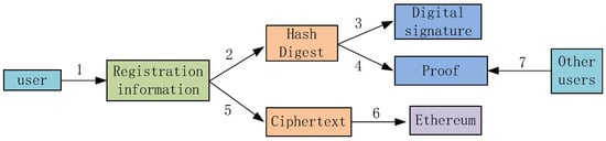 - Calculate the hash digest h of intellectual property registration information m using the hash function. The relationship between m and h is shown in Equation (3).