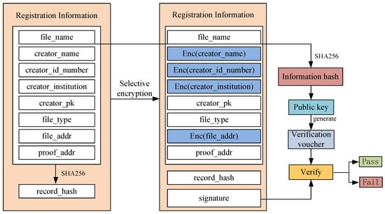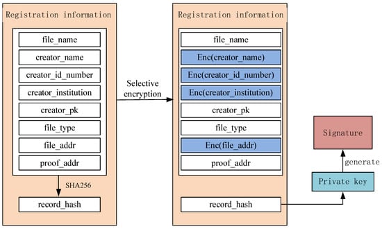 When registering intellectual property rights, it is easy to disclose the user’s personal identity and confidential intellectual property information. In our proposed scheme, users can selectively disclose their identity information or encrypt the information they do not want to disclose. Creators need to upload intellectual property and author-related information as proof of intellectual property registration. The content of the intellectual property registration information structure is shown in Table 2.