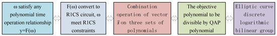 To avoid revealing secret , it is necessary to use the R1CS constraint to describe the operational rules of algorithm equivalently. It is important to publicly disclose the R1CS constraint, then convert to satisfy any computational relationship equivalently, then equivalently transform into the polynomial coefficient vector of the objective polynomial divided by the QAP polynomial, and finally, equivalently transform it into calculating the discrete logarithm point (polynomial commitment) of the elliptic curve based on the polynomial coefficient vector , forming the discrete logarithm difficulty problem. The verifier reconstructed the integer division relationship based on elliptic curve discrete logarithmic points (polynomial commitment) and verified the correctness of the vector , but the prover did not leak the vector . The following sections provide a detailed introduction to NP problems, R1CS constraints, and QAP.