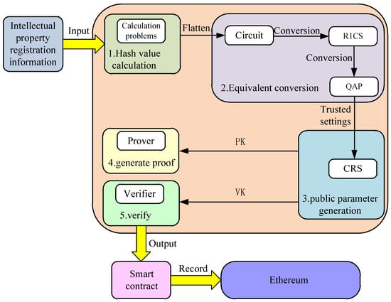 However, blockchain technology also has some shortcomings when used for intellectual property authentication. Intellectual property requires the provision of creators’ personal information, work details, and other privacy information during the authentication process. The transparent nature of blockchain technology requires all information to be stored in public ledgers, and all nodes in the blockchain can view it, which leads to the leakage of creators’ privacy information. Moreover, blockchain technology uses pseudonyms rather than complete anonymity, but with the help of big data analysis and sociological mining methods, real identities in the real world can be mapped to public key addresses [,]. Users all hope that their privacy and security can be protected, especially in scenarios like intellectual property authentication where personal privacy data must be submitted. Therefore, there is an urgent need for a new technology that can achieve intellectual property authentication while protecting privacy data.