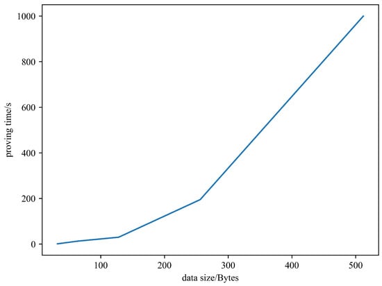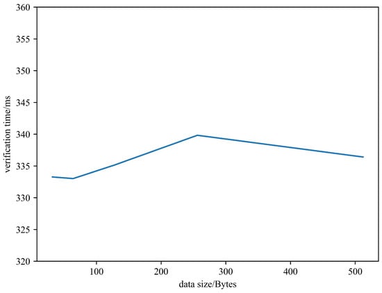 Our scheme utilizes zero-knowledge proof technology to authenticate intellectual property while protecting privacy. The focus is on the efficiency of the zero-knowledge proof, particularly the proving and verification times, which are the two key performance indicators. Proving time is the time required to generate a zero-knowledge proof, during which the prover uses private data (the hash preimage in our scheme) to construct a proof that can prove a certain assertion to the verifier without exposing private data. The proving time depends on algorithm complexity and data size. Verification time is the time when the verifier checks whether the proof is valid based on the proof and the verifying key provided by the prover. It similarly depends on algorithm complexity and data size. Experimental results indicate that while the proving time increases linearly with data size, the verification time remains relatively constant, between 335 ms and 345 ms. Our scheme adopts the method of off-chain generation of proofs and on-chain verification, so as the amount of data increases, the prover’s proof time increases without any impact on the performance of the entire blockchain system. The verification time is very short and almost unaffected by the size of the data. The experimental results are shown in Figure 9 and Figure 10.