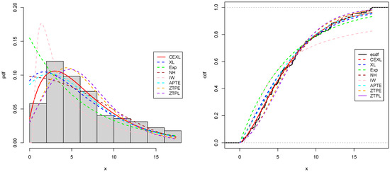 The Inverse Weibull (IW), Nadarajah Haghighi (NH), Alpha power transformed exponential (APTE), Zero truncated Poisson exponential (ZTPE), Zero truncated Poisson Lindley (ZTPL), EXP, and XL distributions are used to compare with our recommended CEXL model. The cdfs of the recommended model can be, respectively, expressed as follows: