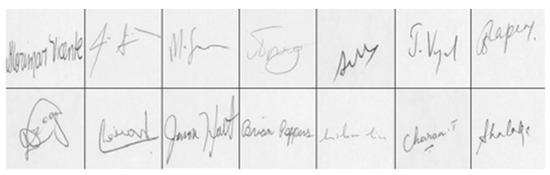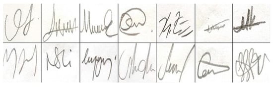 The second dataset used in the study, “Cedar Signature”, consists of real and forged signature images from 55 different people. Both real and forged signatures in this dataset have 55 different classes and each class consists of 24 different signature images. In this study, only real signature images were used. A sample image of the classes in the “Cedar Signature” dataset is shown in Figure 3.