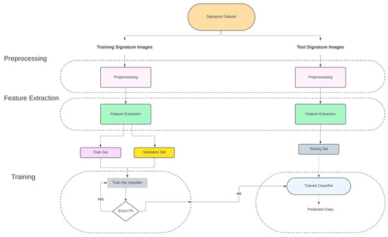 The aim of the proposed method is to provide an effective way to perform classification of handwritten signature images. Figure 5 presents the overview of the proposed method. This method is divided into four different parts. They are listed as (i) pre-processing, (ii) feature extraction, (iii) training, and (iv) classification.