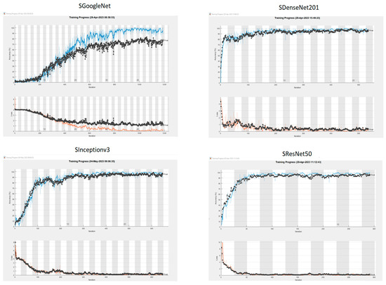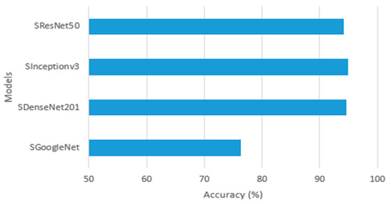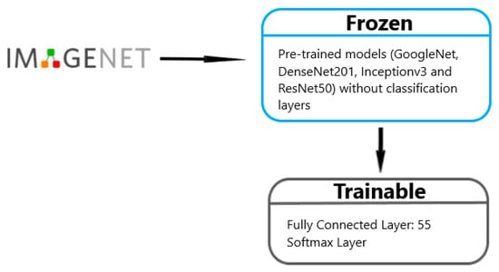 To evaluate the effectiveness of the Si-CNN and Si-CNN+NC models, four different models, namely, Inceptionv3, GoogleNet, ResNet50, and DenseNet201, were used with the transfer learning technique [45]. The feature extraction layers of the pre-trained models are not trained in order to implement this strategy. The widely used ImageNet [46] dataset served as the training ground for these pre-trained algorithms. The layer weights generated for ImageNet were applied as a result. Information is transmitted in this way. Table 2 lists the (1) Top-1 accuracy rate obtained from ImageNet, (2) depth, and (3) number of parameters of the models used in the study.