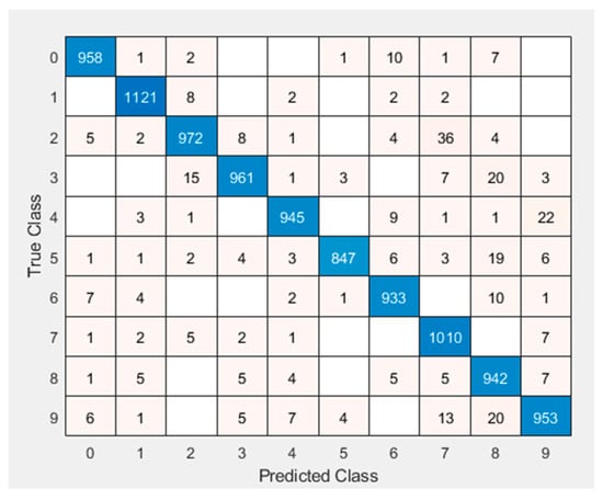 The “1”, “2”, and “7” were determined to be the most accurately recognized numbers, according to the matrix of confusion of the Si-CNN model’s evaluation on the MNIST dataset, which is shown in Figure 22. The “1”, “2”, and “7” were determined to be the most precisely detected numbers in Figure 23, which also displays the matrix of confusion of the analysis of the Si-CNN+NC algorithm on the MNIST dataset. The highest accuracies in both Si-CNN and Si-CNN+NC architectures are “1”, “2” and “7”, indicating the consistency and effectiveness of the proposed models. In addition, when the results obtained from these two new proposed models are compared, the lowest accuracies were obtained from the numbers “5” and “6”.