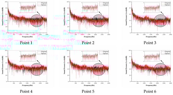 The time-domain pressure signal is Fourier transformed to obtain the frequency-domain signal. The computational aeroacoustics (CAA) method was utilized to convert the pulsating pressure signal into the sound pressure level signal. Figure 15 displays the aerodynamic noise sound pressure levels at frequencies for the nine monitoring points in the rearview mirror wake region. Comparing the aerodynamic noise simulation results, in the rearview mirror wake region, the original model and the optimized model essentially exhibit similar characteristics in the frequency range from 0 to 500 Hz. However, as the frequency increases, the optimized model’s rearview mirror wake generates a slightly lower sound pressure level than the original model’s rearview mirror near the frequency of 2000 Hz.
