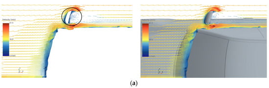 In order to analyze the variability of the flow field properties before and after the wing optimization, six cross sections were divided in the rearview mirror region and wheel region of the car. The specific cross-section locations are shown in Figure 17a. Figure 17b,c illustrates the velocity vector plot in the X = 1 m rearview mirror region. Attributed to the hindering effect of the rearview mirror, a symmetric vortex region appears in the rearview mirror wake region, which serves as one of the sources of aerodynamic noise. Compared with the original model, the optimized model shows a decrease in the value of the velocity vector, and this means that the air flow is in a relatively stable state. And the vortex in the optimized model near the side window region is improved. Thus, this will help to reduce the aerodynamic noise.