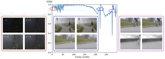 Figure 3 shows a plot of structural similarity values [50] for the initial 300 frames of a video. The plot demonstrates that each frame exhibits a strong resemblance to its preceding and following frames, as indicated by the red-dotted oval, except during abrupt video changes highlighted by the blue-dotted and pink-dotted ovals. Given the infrequency of these scene changes, it is feasible to compute the haziness degree estimate for a specific frame and apply the computed value to the subsequent frame. This approach not only addresses the synchronization problem but also significantly reduces the required hardware resources for implementation.