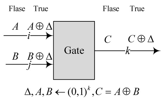 for all inputs . The equation means that the generator encrypts the output wire label using the corresponding combination of input wire labels. For example, for an AND gate with input value , the output value should be 0; thus, the generator encrypts using and , where the input wires are i and j and the output wire is k. In this way, the generator generates four ciphertexts successively for each gate according to the topology order of the circuit.