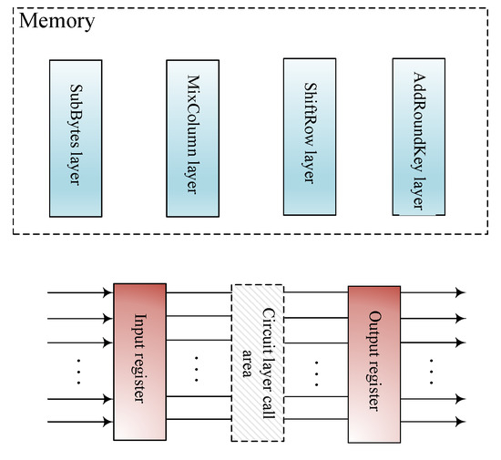 To enable the reuse of circuit units, we propose designing a circuit layer for each algorithm and setting an input and output 128-bit register at both ends of the circuit layer call area. In the AddRoundKey layer, an additional 128-bit register is needed for the generator to input the round key.