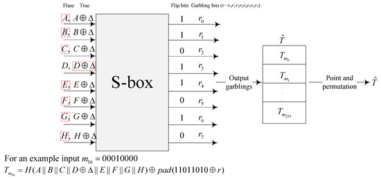 It should be noted that if we use the second idea in [22] to garble an S-box that has eight input and eight output wires, instead of using the garbling scheme in [22] where the generator uses eight input wire labels to encrypt eight corresponding output wire labels, the generator can encrypt the corresponding “flip bit string” according to the mapping law of the S-box. For example, for an S-box that maps 00111100 to 11010101, the flip bit string is . These flip bit strings are used to flip the least significant bit (lsb) of the input wire labels of the S-box. Since the final truth values of the output are determined by the lsb of the output wire labels, and there are only XOR operations between wire labels in other parts of the AES circuit, flipping the lsb of the input wire labels of the S-box can eventually produce the correct output, thus reducing the number of ciphertexts by converting the encryption of eight output wire labels into only one flip bit string. Furthermore, by introducing optimized S-box structures [16,17,18,19,20,21], where each flip bit string is almost exclusively mapped to an input byte, the security of our garbling scheme can be effectively improved without additional overhead.