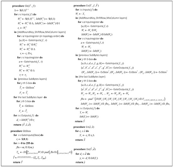 Garbling scheme for AES circuit. GbSbox* and EvSbox* denote the original S-box garbling scheme, and GbSbox denotes our S-box garbling scheme. denotes a reversible injective mapping: .