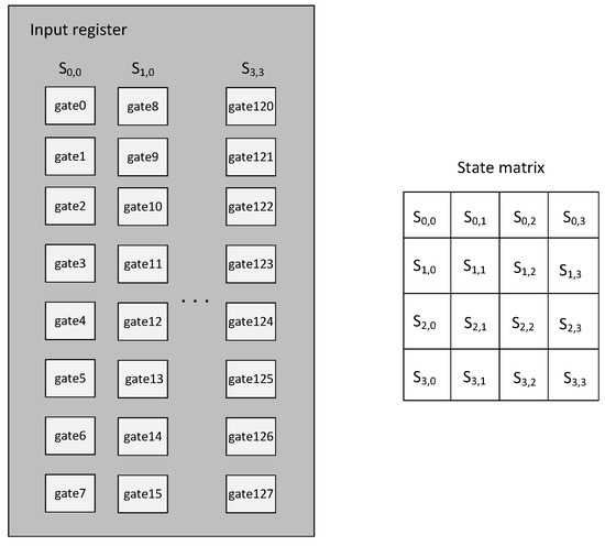 We demonstrate the construction of the MixColumn, ShiftRow, AddRoundKey, and SubBytes layers in detail. As shown in Figure 3, each circuit layer is connected between an input register and an output register. These registers are composed of 128 gate objects. Each group of eight gates, sequentially arranged from 0 to 127, constitutes a byte within the AES state matrix, as illustrated in Figure 6.