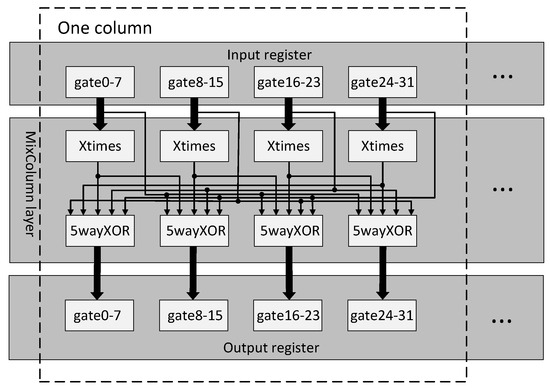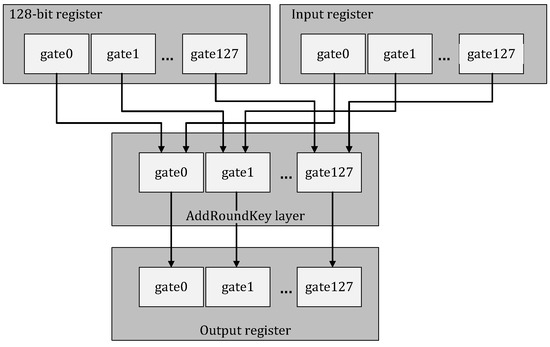 The core computation of the AddRoundKey layer is the XOR operation between two bytes. Except for the input register, which stores the state matrix, an extra 128-bit register is needed for the generator to input the round key. It is important to note that the key expansion algorithm can be executed locally by the generator. The AddRoundKey layer is shown in Figure 10.