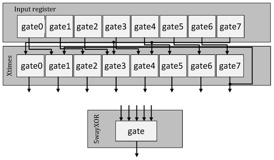 After the decomposition of the computation, the MixColumn layer can be executed only by the XOR gate. We show the MixColumn layer in Figure 8, where Xtimes executes the computation, and 5wayXOR is a gate with five input wires, executing the XOR operation. The construction of Xtimes and 5wayXOR is shown in Figure 9.