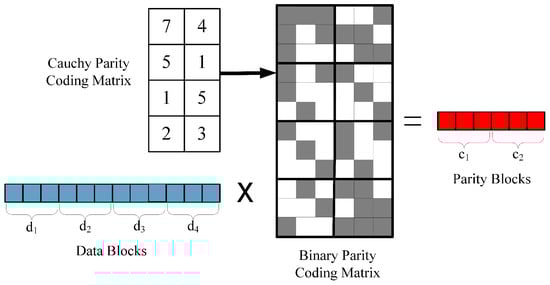 Using Algorithm 1, the elements of the finite field GF(23) are represented by the binary array , and the encoding matrix is transformed into an binary encoding matrix. In traditional RS codes, the parameter w needs to be larger than the data bit width, which often results in the selection of the finite field being restricted to larger scales, such as GF(28), GF(216), or GF(232). However, Cauchy RS codes offer greater flexibility in this respect. In the design of Cauchy RS codes, the selection of w only needs to satisfy the condition that , where k is the number of data blocks, and m is the number of parity blocks. This means that, compared with RS codes, Cauchy RS codes allow the use of smaller finite fields to perform encoding and decoding operations. This characteristic not only reduces computational complexity but also decreases the demand for storage space while improving the efficiency of encoding and decoding.