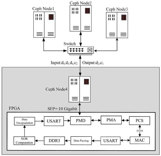 Figure 2 also details the entire process of data flow. After receiving the surviving Cauchy RS(4,2) data (such as , , , ) from the Ceph system, these data are first processed by Ceph Node4. At this stage, the data are converted to hexadecimal format and decoded through FPGA to recover the damaged data blocks (such as and ). Subsequently, these data blocks are distributed through Ceph’s data balancing strategy, thus ensuring the efficient and balanced operation of the entire system.