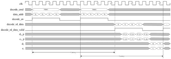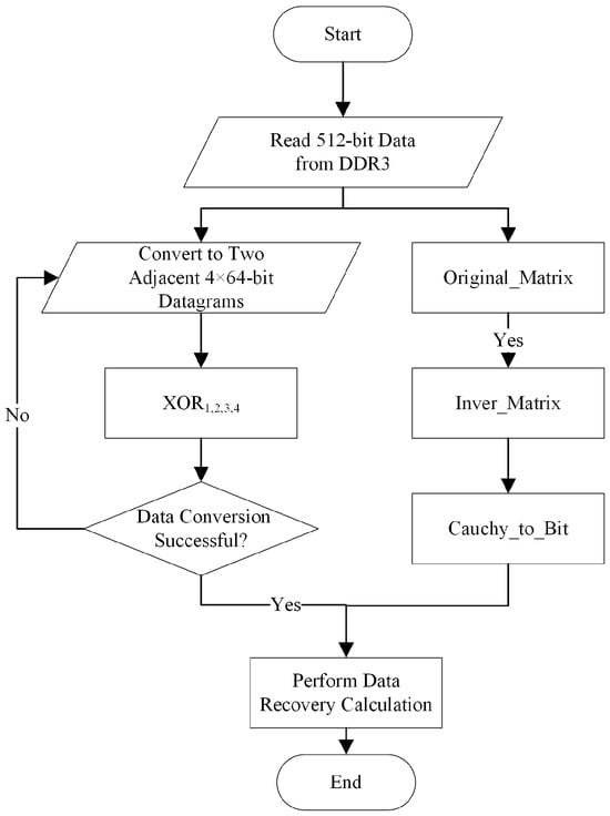 In the decoding workflow of the AMDER-Ceph scheme’s Cauchy RS codes, hardware acceleration is used to enhance the recovery efficiency of four Cauchy RS codes: Cauchy RS(8,1), Cauchy RS(8,2), Cauchy RS(8,3), and Cauchy RS(8,4). The algorithm is defined over GF(24) with the primitive polynomial . Data messages are divided into four 64-bit data groups, with a total size of 256 bits. The decoding module includes four specially designed XOR logic units (XOR1, XOR2, XOR3, XOR4), responsible for performing decoding calculations. The 512-bit wide data read from DDR3 is converted into two adjacent 4 × 64-bit data messages, and , by the preprocessing module. At the same time, the original matrix Original_Matrix, upon inversion to Inver_Matrix, is then binary-arrayed to form Cauchy_to_Bit and Decode_Matrix. Once the data conversion is complete, multiplying the matrix Decode_Matrix with the surviving data yields the lost data.