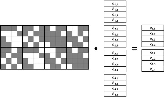 In the scenario depicted in Figure 1, we observe the process of Reed–Solomon (RS) encoding for , , by converting a specific encoding matrix into its binary matrix form. In this binary matrix, gray blocks represent 1, while white blocks represent 0. The encoding operation involves multiplying a 1 × 12 binary vector with a 12 × 6 binary matrix.