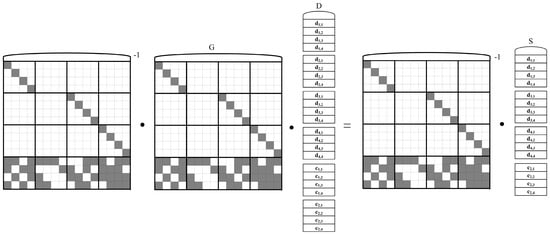 In the diagrams, , , , and respectively represent the first, second, third, and fourth data groups of the first data message. The others follow similarly. Since only 0s and 1s exist in the binary encoding matrix, the encoding calculation process only needs to perform XOR logical operations to obtain the parity messages. For example, taking the first data group of the parity message as an example, the calculation is implemented according to the fifth row of the binary encoding matrix, as shown in the following Equation (13):