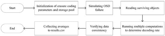 Testing with Native Ceph Plugins: For the performance testing of the Ceph storage system, especially using the Jerasure, Clay, ISA, and Shec decoding plugins, we developed a series of Bash scripts to evaluate throughput with different data volumes and erasure coding configurations. These scripts were designed to test a range of file sizes, specifically 10 KB, 100 KB, 1 MB, and 4 MB, and to explore multiple erasure coding configurations, including Cauchy RS(8,2), RS(8,3), and RS(8,4). The initial steps of the experiment involved creating a file named results.csv to collect and store all test data. Then, using the ceph osd erasure-code-profile set and ceph osd pool create commands, we meticulously configured the required erasure coding parameters and established the corresponding storage pools. Through the rados bench command, we conducted benchmark tests for different file sizes and erasure coding configurations. To obtain reliable data, each configuration combination was tested 1000 times to calculate the average throughput. Upon completing data recovery and verifying data consistency, all test data were precisely recorded in the results.csv file, providing a rich data resource for subsequent analysis. Figure 10 shows the specific flowchart of the Ceph decoding plugin test script.