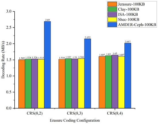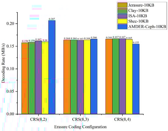 From the perspective of file sizes, AMDER-Ceph exhibited excellent performance across various file dimensions. For smaller 10 KB files, although the inherent startup latency and data transmission overhead of the FPGA might result in a slightly lower throughput for AMDER-Ceph compared with native Ceph plugins, its performance advantage becomes significant as file size increases to 100 KB, 1 MB, and especially 4 MB. This indicates that, with increasing file size, AMDER-Ceph effectively overcomes the initial latency, leveraging the powerful parallel processing capabilities of the FPGA. In the tests with 4 MB files, AMDER-Ceph, utilizing its optimized data flow processing and the FPGA’s parallel computation capabilities, achieved a throughput of 109.254 MB/s under the Cauchy RS(8,2) configuration, significantly surpassing other plugins.