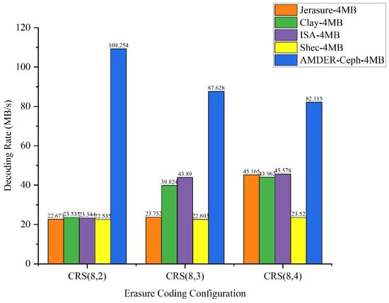 Furthermore, from the perspective of erasure coding configurations, AMDER-Ceph outperformed traditional Ceph plugins such as Jerasure and ISA in all tested configurations, including Cauchy RS(8,2), RS(8,3), and RS(8,4). This performance difference is attributed to AMDER-Ceph’s hardware-specific optimizations on the FPGA, including dedicated hardware acceleration and low-latency optimization, as well as more efficient memory bandwidth utilization. Additionally, the AMDER-Ceph scheme’s software stack is more streamlined, reducing additional protocol and operating system overheads, allowing it to process large files more quickly.