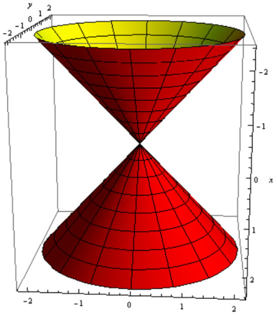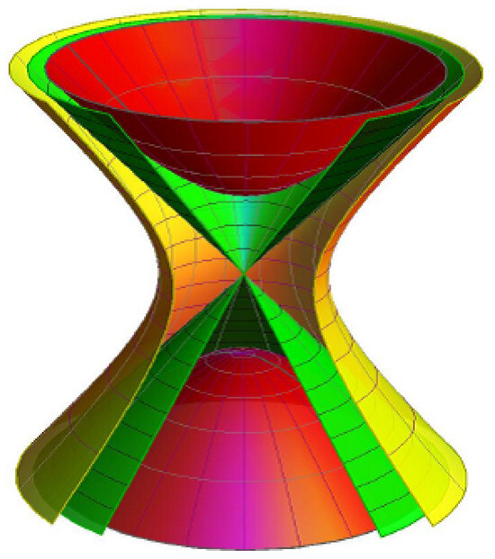 It follows that Equations (1) and (2) are congruous. Due to this we include the following map (E. Study map). The ring-shaped hyperboloid is in bijection with the family of lines, the common asymptotic cone is in bijection with the family of null lines, and the oval-shaped hyperboloid is in bijection with the family of lines (see Figure 1).