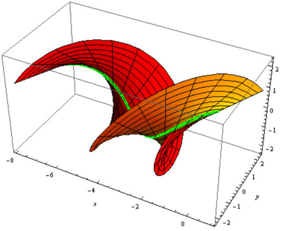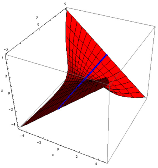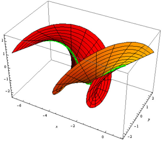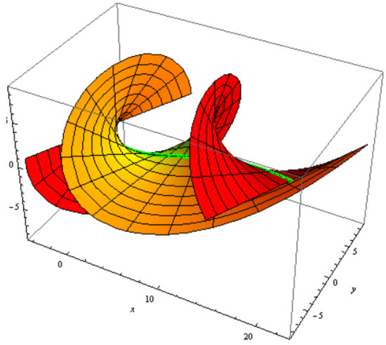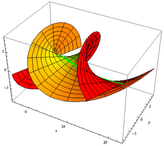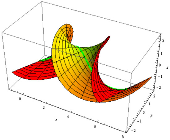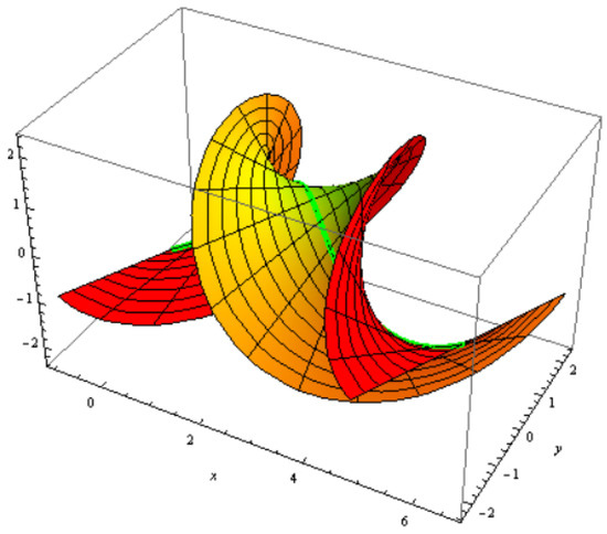 which is a family of two-parameter tangential surfaces; for , , , and (Figure 8 and Figure 9).