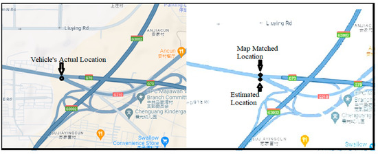 In the equation, i represents the candidate road index and represents the maximum value for the similarity between the vehicle’s trajectory and the candidate road. Therefore, the i-th road is considered the matched road. If the matched road matches the vehicle’s traveling route, it is considered a correct match; otherwise, it is considered an incorrect match.