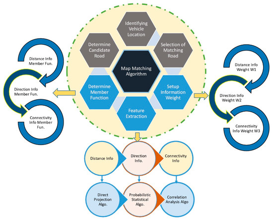 The foundation of the map-matching algorithm is based on pattern recognition theory, which primarily leverages three critical types of information: direction, connectivity, and distance. The fuzzy logic-based map-matching technique integrates this information using fuzzy mathematical theory. This approach calculates the comprehensive membership degree of candidate roads to determine the most suitable matching road. The matching process encompasses three primary steps: identifying candidate roads, selecting the optimal matching route, and accurately determining the vehicle’s location. The detailed process is illustrated in Figure 4 below.