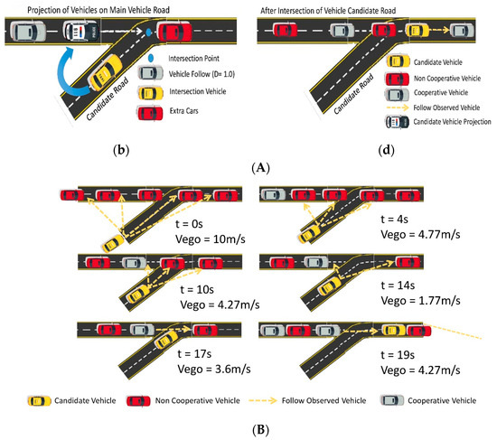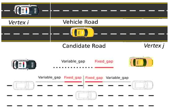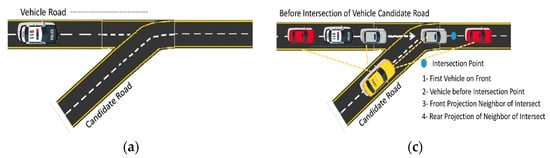 We simulate a scenario in which vehicles travel at a constant speed through a diverging junction in a cross-road scenario, as shown in Figure 8. Unlike parallel road segments, the direction information for each candidate road in cross-road scenarios is different. Additional considerations need to be taken into account regarding the segmentation points for the direction information and the weights of the direction information based on the foundation of parallel road segments. During the simulation, the weight of the connectivity information, denoted as , is fixed, and equal weights are assigned to the distance information and the direction information, which means