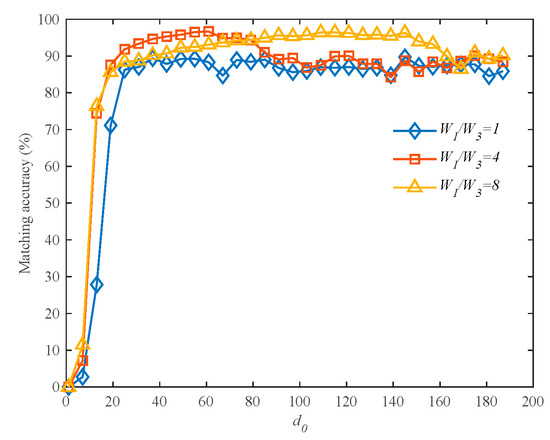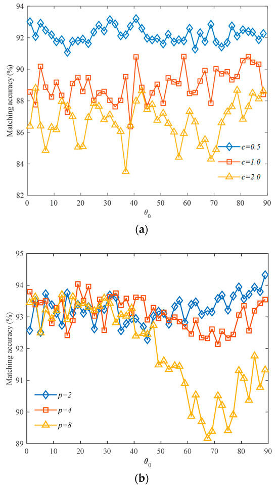 From Figure 9a, it can be observed that as increases, the matching accuracy fluctuates around a certain value. Therefore, the average accuracy over the entire range of the independent variable is taken as an indicator to measure the impact of the c value on the algorithm’s performance. The average accuracy for different c values is shown in Table 4. When is set to , the matching results have a higher average accuracy. From Table 4, it can be seen that at , the average accuracy reaches its highest point and then starts to slowly decrease as the c value increases.