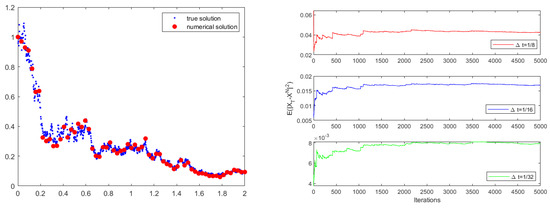 We approximate the “true solution” using the Euler–Maruyama method with a sufficiently small step size (here, ). In Table 1, we compare the errors, convergence rates (CR for short) and operating time of the Euler scheme, Milstein scheme and Scheme 1. The results demonstrate that Scheme 1 exhibits a superior convergence rate. In the left of Figure 1, we depict the numerical solution resulting from Scheme 1 with a step size of , alongside a sample path’s “true solution”. We obtain the mean-square convergence stability result of global errors to test stability in the right of Figure 1. The numerical results here are consistent with the results we established regarding convergence and stability.