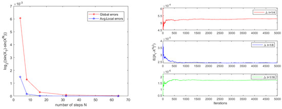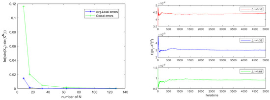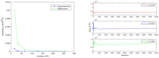 In this example, we assume . We test the convergence rate and errors of Scheme 1 by setting the delay function , , , , ; the error and convergence results are provided in Table 3. As expected, Scheme 1 can obtain global second-order and local third-order convergence rates, which are in agreement with theoretical results. We also plot the lines of average local errors (Avg.Local Errors for short) and global errors with respect to the steps N in the left of Figure 3. Furthermore, the figure intuitively displays that the theoretical results are correct. For three different time steps , and , we obtain the mean-square convergence stability result of global errors in the right of Figure 3.