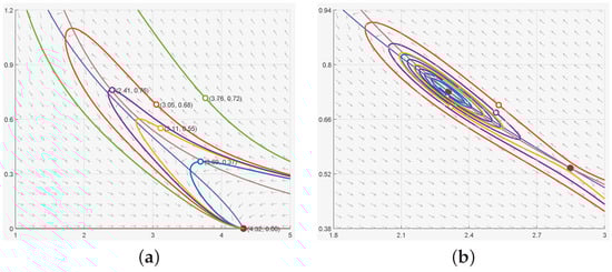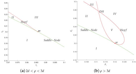 In this section, we will conduct numerical simulations based on the previous analysis. Firstly, we employ the MatCont7P4 program to generate bifurcation diagrams. Taking , , and , , then We keep these parameters constant and only vary the values of and , thus obtaining the bifurcation diagram Figure 1a. In this figure, the blue curve represents the saddle-node bifurcation curve, whereas the red curve represents the Hopf bifurcation curve. BT denotes the Bogdanov–Takens point with codimension 2. These three curves divide the parameter plane into three parts. In Figure 2, we use the Phase Plane software to provide the global phase portraits in these three parts. Combining Figure 1a and Figure 2, we can clearly observe the variation process of the phase portraits with the changes in parameters and .