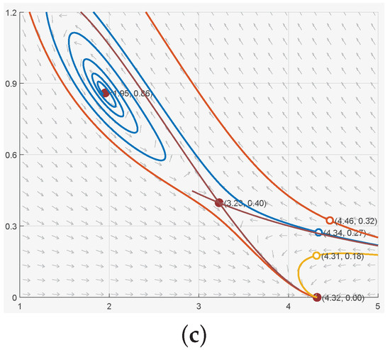 Global phase diagram of system (4) in Figure 1a when . (a) In region I, the system has only one disease-free equilibrium , which is globally stable; (b) in region , there are two positive equilibrium points and in the system, and near there exists an unstable limit cycle; (c) in region , there are two positive equilibrium points and in the system. is a stable focus.