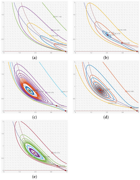 Global phase diagram of system (4) in Figure 1b when . (a) In region I, the system has only one disease-free equilibrium E0, which is globally stable; (b) in region , there are two positive equilibrium points and in the system, and is a stable focus or node, whereas is a saddle; (c) in region the system may exhibit two limit cycles; (d) in region is a stable focus or node, and is a saddle; (e) in region the system may exhibit two limit cycles.