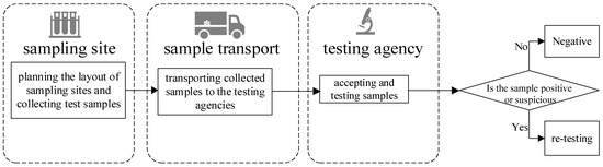 The scheduling network for test samples consists of discrete sampling sites and testing agencies. The number of samples waiting to be collected at each sampling site varies, as does the testing unit price and testing capacity of each testing agency. A complete sample scheduling process is shown in Figure 1, including sample collection, sample transport, and sample testing.