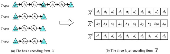 Figure 5 gives an example of the conversion from the basic encoding form to the three-layer encoding form. First, the sampling sites of each trip visited are put into according to the order of vehicle 1 to |K|. After that, let the agencies in and represent the departure and delivery agencies of the trip in which the corresponding sampling sites are located, respectively.