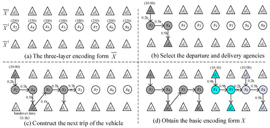Figure 6 gives an example of individual decoding in the three-layer encoding form. Assume that there are three testing agencies and eight sampling sites, the scheduling point tl and the latest collection moment are 10:00 and 12:00, respectively, and the vehicle capacity is 500 tubes. Figure 6a shows the three-layer encoding form of the individual. and represent the testing agencies that the vehicles departed from and delivered to, respectively, indicates the collection order of sampling sites, and the value above the sampling sites represents the number of samples that need to be collected. The sampling site and testing agencies in each column of the three-layer encoding correspond to each other. The decoding process is as follows. First, one of the available vehicles from the first testing agency d3 from the left of is randomly selected to start its first trip, visiting the sampling sites of in turn. After collecting the samples from s2 and s4, the vehicle is loaded with 450 tubes, leaving insufficient capacity to load samples from s5. At this point, the vehicle sends the samples to the delivery agency d2, which is in the same column as s4, completing the first trip, as shown in Figure 6b. Then, the vehicle departs from d2 to collect samples from the remaining sampling sites in turn after completing the handover at d2, as in Figure 6c. After completing sample collection at s5 and s3, the vehicle has driven a total of 0.2 + 0.3 + 0.5 + 0.1 + 0.1 + 0.7 = 1.9 h, and the current moment is 11:54. If the vehicle continues to visit s1, the latest collection moment of 12:00 will be exceeded. Therefore, after collecting the samples at s3, the vehicle delivers them to the testing agency d1, which is in the same column as s3, completes its second trip, and ends the transfer task for the current scheduling period. Subsequently, the routes of the second vehicle are planned. At the moment tl = 10, an available vehicle is randomly selected from the departure agency d2 corresponding to sampling site s1. If no vehicle is available at d2 at this time, the vehicle that arrives at d2 at the earliest time is selected. As shown in Figure 6d, the vehicle can perform the collection task for the current scheduling period starting from 10:10. The remaining sampling sites are collected the same way as above until all samples are collected. In the end, we obtain the vehicle routes Trip1, Trip2, and Trip3 as d3→s2→s4→d2→s5→s3→d1, d2→s1→s7→d1, and d3→s6→s7→d1, respectively. The basic encoding form of the individual is X = { Trip1, Trip2, Trip3 }.
