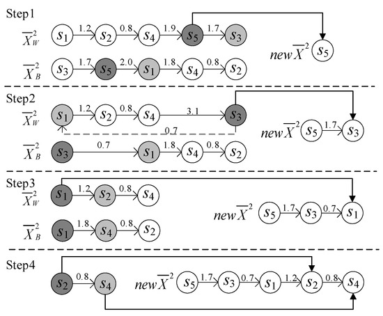 Figure 7 gives an example of the greedy crossover. Let and denote the inferior and superior individuals represented in the three-layer encoding form. In Step 1, a sampling site (e.g., s5) is randomly selected as the starting node of the second layer encoding for the new individual, and a direction (e.g., to the right) is determined randomly. In Step 2, the closest point to s5 (i.e., s3) is determined from the two sampling sites (s1 and s3) adjacent to the right side of the starting node s5 in and as the next sampling site of . In Step 3, the next sampling site is determined, i.e., s1, the node nearest to s3 among the nodes adjacent to the right side of and . In Step 4, only the last two sampling sites s2 and s4 are unselected. Since s2 is closer to s1, the next sampling site is s2, and s4 is the last. The length of the new route is 4.4 km, which is 1.2 km and 1.9 km less compared to and , respectively.