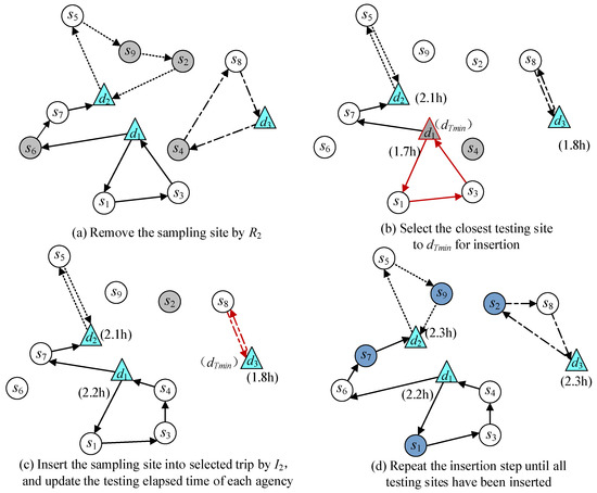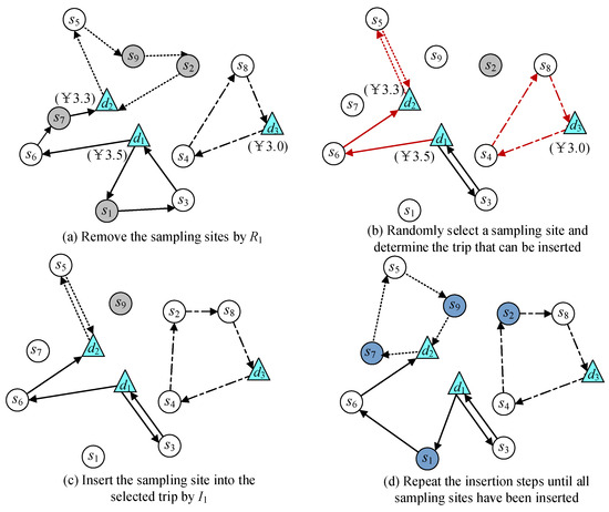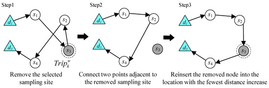 Step 3.2: The last trip of each vehicle in the individual Xg is merged to form the set LT. For each sampling site removed in Step 3.1, determine the nearest trip from to the last sampling site of each trip in LT. Calculate the distance increase after inserting into the left and right side of the last sampling site of the trip, and determine whether the capacity constraint is satisfied after the insertion on the side with the lesser increase. If satisfied, then insert it. Otherwise, find the next closest trip in LT and re-execute the above process. If no trip in LT meets the requirement, add a new trip to visit . Determine the nearest testing agency to with available vehicles and use it as the departure and delivery agency for the additional trip. This step reinserts all the sampling sites removed in Step 3.1 into individual Xg.