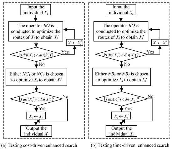 In this work, KMOSFLA is designed as a periodic rescheduling method, which differs from the existing work in the following ways: (i) A convertible encoding mechanism is designed. Through encoding conversion, the algorithm can track the valuable information of elite individuals for large-scale exploration, while implementing fine mining of the vehicle routes using objective knowledge, which improves the convergence accuracy of the algorithm. In contrast, the encoding of the existing MDVRP work is fixed, and it is difficult for the algorithm to carry out diversified search patterns. (ii) The criterion for SFLA to receive new individuals in multi-objective optimization is relaxed when updating the worst frog of a memeplex, with the aim of retaining the solution that is not dominated by the worst frog. In contrast, the existing work only receives the new frog that dominates the worst frog of the memeplex, and the population in the later stage is difficult to update and easily falls into the local optimum. (iii) The individual updating method applicable to TSVRP is designed. A leaping rule based on greedy crossover and genetic recombination is proposed to update individuals, which extracts the effective knowledge of both optimal and poor individuals. In addition, an objective-driven enhanced search is designed to realize extreme value mining on different objectives of the algorithm.