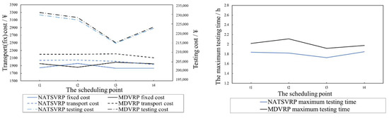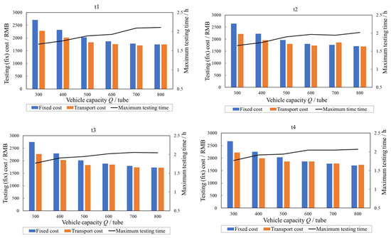 Considering the difference in testing unit prices and testing capacities of testing agencies, the cross-depot collaborative transport method is adopted, and the testing cost , transportation cost , and fixed cost are formulated as follows: