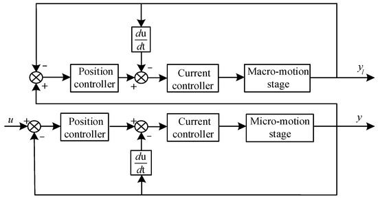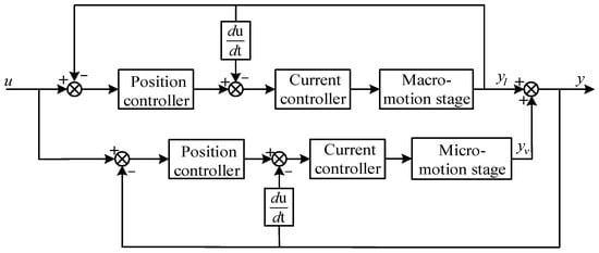 Many studies [9,10,11,12] have shown that macro–micro composite motions need to be controlled by closed-loop control structures. For example, ref. [13] proposed a dual-feedback closed-loop control method based on sampling time delay, which gives the macro and micro control system a reasonable time delay by increasing the sampling rate, thus improving the platform control effect. In [14], a master–slave control structure is explored that allows the micro stage to rapidly counteract system perturbations, outperforming the macro stage. The macro stage’s function is to track the micro stage, ensuring that the micro platform’s final position remains within its operational limits. In addition, when the macro stage moves quickly to a certain error range, the threshold-based switching control structure, which starts the micro stage to compensate for the error to achieve high-speed and high-precision positioning, is also widely used [15,16,17,18,19,20,21].