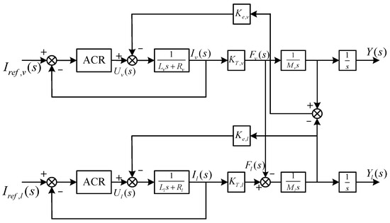 According to Equation (4), the motor transfer function can be obtained via the macro–micro master–slave structure control block diagram shown in Figure 6.
